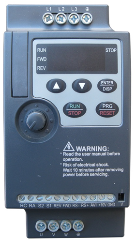 Four multi-function input terminals, realizing functions including fifteen section speed control, program running, four-section acceleration/ deceleration speed switch, UP/DOWN function and emergency stop and other functions